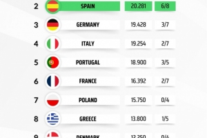 体育资讯3月20日讯 欧战1/8决赛战罢,媒体列出了本赛季各联赛欧战积分排名,英超24.791分居首,只需要一场平局就能锁定额外欧冠席位,西甲20.281分次席,6支球队晋级欧战8强形势大好。