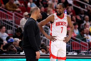 杜兰特只用思考得分就好:上半场11投16分。火箭半场领先。