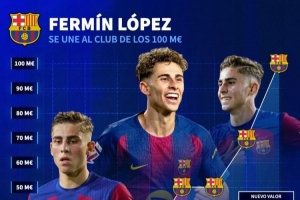 体育资讯3月17日讯 德国转会市场更新社媒动态,晒出了巴萨中场费尔明身价变化图。